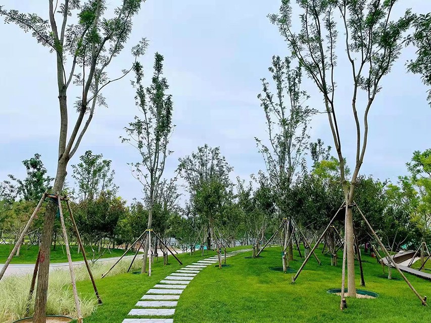 公園植物配置以鄉(xiāng)土樹種作為骨干樹和基調(diào)樹,突出地方特色,季相變化上充分突出春花秋葉的季節(jié)性特色,成片種植綴花草地和觀賞草,形成大尺度、小精致的植物景觀特色。