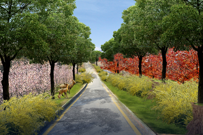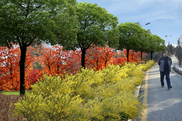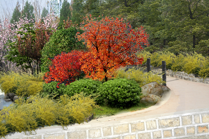 豐富植物景觀層次——公園植被以側(cè)柏、龍柏、黃櫨為主,局部地區(qū)植物長勢并不良好,致使山體巖石裸露,現(xiàn)一方面需對裸露地區(qū)進(jìn)行植物補(bǔ)植,改善山體生態(tài)環(huán)境;另一方面對道路兩側(cè)進(jìn)行植物補(bǔ)植,并適當(dāng)增加色彩鮮明的季相花卉,完善道路兩旁植物景觀層次。