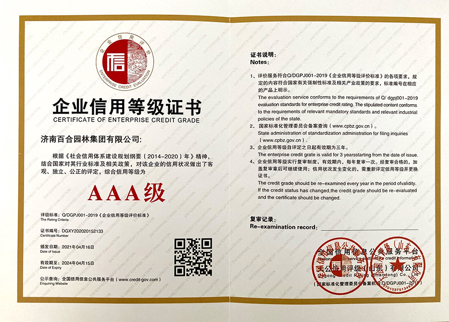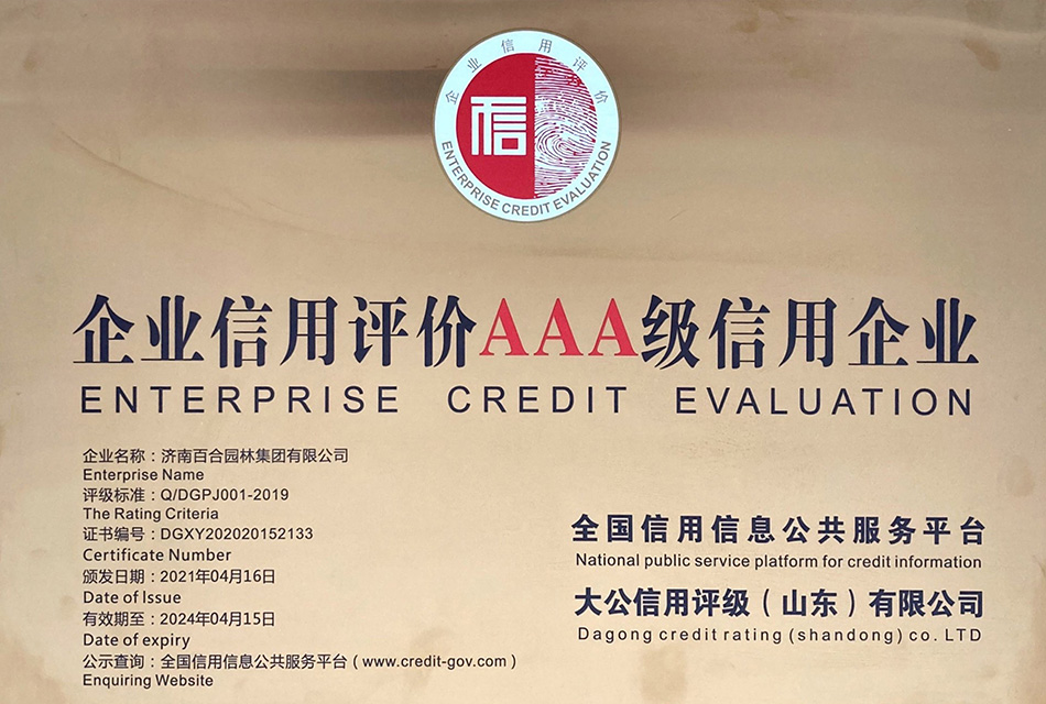 全國信用信息公共服務(wù)平臺(tái)和大公信用評(píng)級(jí)(山東)有限公司對(duì)百合園林集團(tuán)的信用狀況進(jìn)行了綜合評(píng)定,評(píng)價(jià)服務(wù)符合Q/DGPJ001-2019《企業(yè)信用等級(jí)評(píng)價(jià)標(biāo)準(zhǔn)》的各項(xiàng)要求,規(guī)定的內(nèi)容符合國家有關(guān)強(qiáng)制性標(biāo)準(zhǔn)及相關(guān)產(chǎn)業(yè)政策的要求,評(píng)定信用等級(jí)為AAA級(jí)。