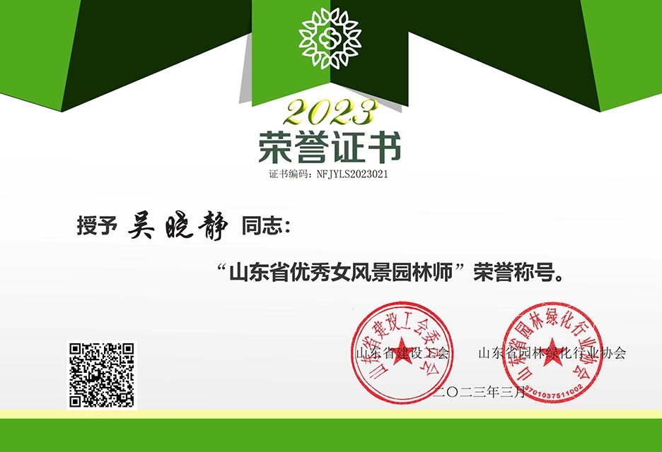 近日,由山東省建設工會和山東省園林綠化行業(yè)協(xié)會組織開展的山東省園林綠化行業(yè)第一屆“優(yōu)秀女風景園林師”選樹結果揭曉,宣傳展示園林綠化行業(yè)女性從業(yè)者做出的突出貢獻,百合園林集團李成鳳、吳曉靜同志喜獲“山東省優(yōu)秀女風景園林師”榮譽稱號。